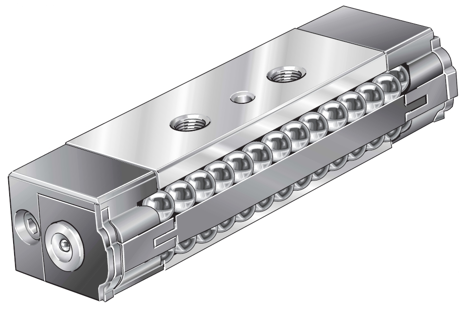 Eine Führung besteht aus mindestens einem Führungswagen mit vollkugeligem Laufsystem, einer Führungsschiene und Verschlusskappen aus Kunststoff.