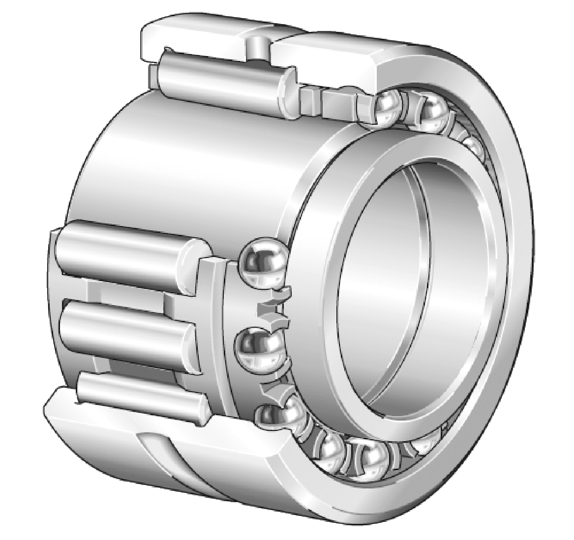 Die kombinierten Nadellager bestehen aus einer Nadelreihe zur Aufnahme hoher Radialkräfte und einer Kugel- oder axial angeordneten Zylinderreihe, die die Axialkräfte aufnimmt.